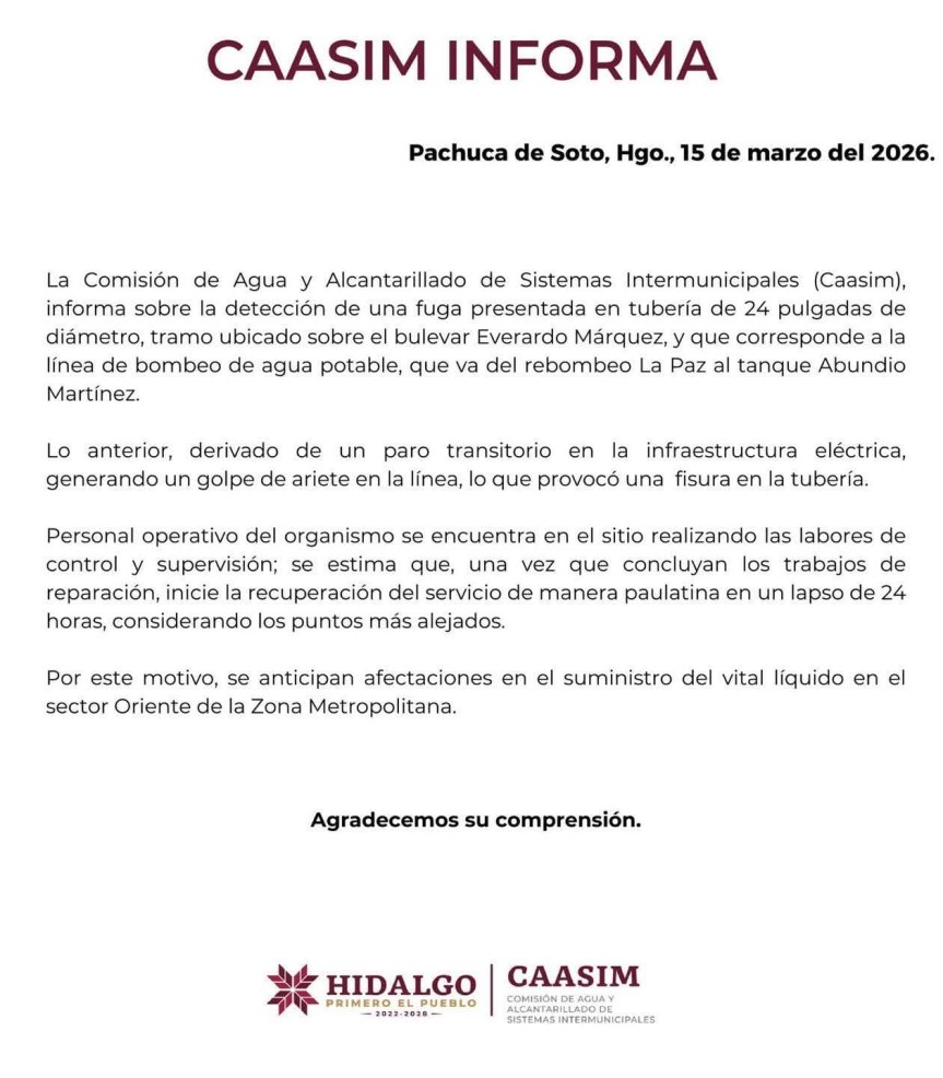 Una fuga registrada en una tubería de 24 pulgadas provocará afectaciones temporales en el suministro de agua potable en el sector oriente de la zona metropolitana de Pachuca, informó la Comisión de Agua y Alcantarillado de Sistemas Intermunicipales (CAASIM).