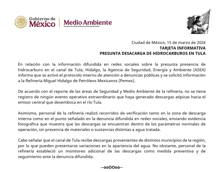 De acuerdo con el reporte de las áreas de Seguridad y Medio Ambiente de la refinería, no se registró ningún evento operativo extraordinario que haya generado descargas atípicas hacia el emisor central que desemboca en el río Tula.
