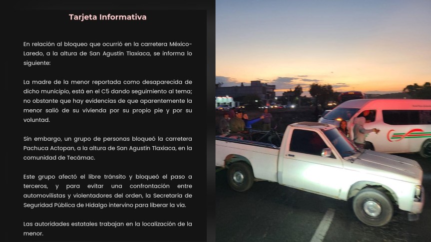 El Gobierno del Estado de Hidalgo informó sobre los hechos registrados en la carretera México-Laredo, a la altura de San Agustín Tlaxiaca, donde un grupo de personas bloqueó la vía en relación con la desaparición de una menor en dicho municipio.